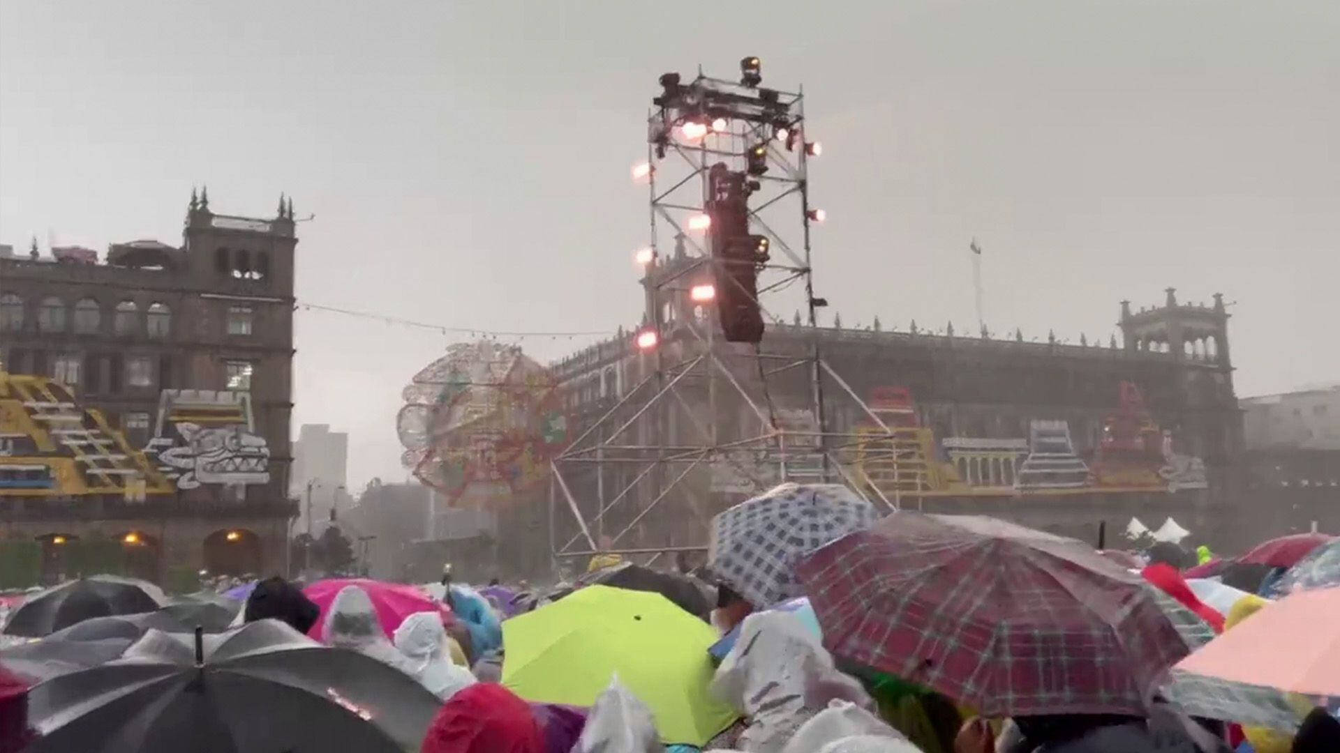 (Foto: X @fchiguil)Cientos de personas que esperan el concierto de Grupo Frontera y el Grito de Independencia fueron sorprendidos por la lluvia en el Zócalo de la Ciudad de México.