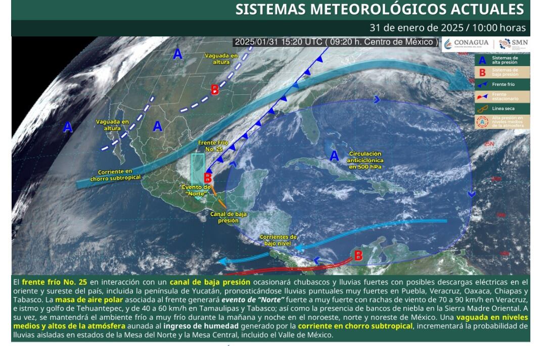 Por otra parte, una vaguada en niveles medios y altos de la atmósfera sobre el noroeste y norte del país, aunada al ingreso de humedad generado por la corriente en chorro subtropical, incrementará la probabilidad de lluvias aisladas en estados de la Mesa del Norte y la Mesa Central, incluido el Valle de México.