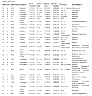 Las defunciones de habitantes de otros estados corresponden a: nueve residentes de Nayarit; dos residentes del Estado de México; un residente de Zacatecas, dos residentes de Baja California, dos de Michoacán, uno de Durango, un residente de Veracruz, un residente de Hidalgo, un residente de Aguascalientes, dos residentes de Sinaloa, un residente de Chiapas, un residente de Chihuahua y un residente de Puebla, quien falleció en la Central Camionera de Tlaquepaque.