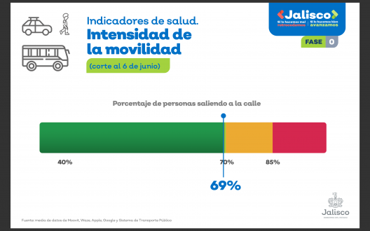 De acuerdo con las cifras arrojadas de la movilidad, Jalisco se encuentra en el límite de entrar en el amarillo. Con inicio de la reactivación económica se contemplaba que la movilidad se incrementaría de 6 a 7 puntos. La semana previa al arranque de la reactivación gradual de Jalisco, esta se encontraba por encima de 60, a raíz de que se aflojaron las medidas sanitarias días antes del inicio de la reactivación económica. “Necesitamos volver a bajar la movilidad”, puntualizó el Gobernador.