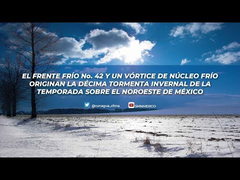 Hoy, el Frente Frío Número 42 y la Décima Tormenta Invernal recorrerán el noroeste de México, generarán ambiente muy frío y nevadas en zonas montañosas de Baja California, Chihuahua, Durango y Sonora, así como rachas de viento de 80 a 100 kilómetros por hora (km/h) en Chihuahua y Durango, y oleaje de 2 a 4 metros (m) en la costa occidental de la Península de Baja California.