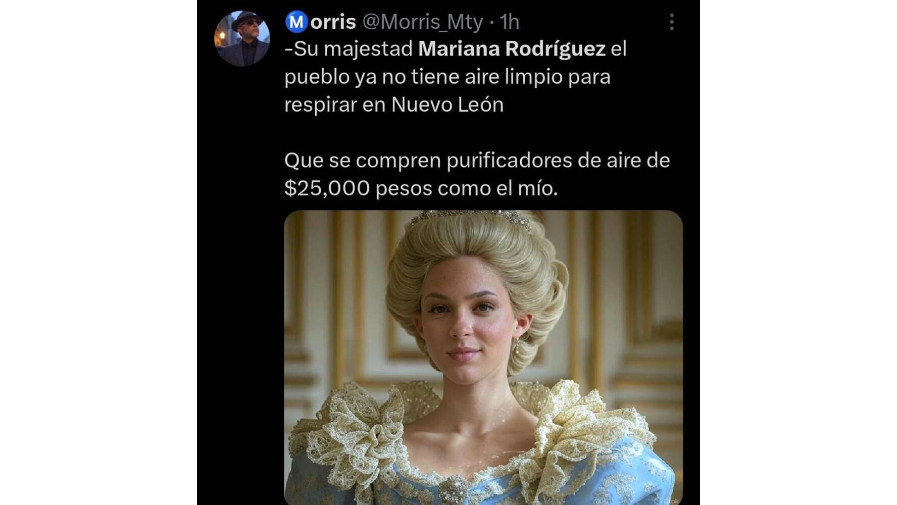 ¿María Antonieta o Maria…na Rodríguez? La esposa de Samuel García recomendó un purificador de aire de más de 20 mil pesos y la compararon en memes en redes sociales con la reina consorte de Francia del Siglo XVIII, que supuestamente pidió que le dieran pastel al ‘pueblo’ para combatir el hambre.